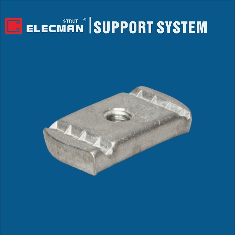 ELECMAN®Gegalvaniseerde stalen spanmoeren zonder veer zijn essentieel voor het kanaalondersteuningssysteem.Ze worden door de open zijde van het kanaal gestoken en vervolgens 90 graden gedraaid waar hun getande groeven tegen de retourflens van het kanaal passen.